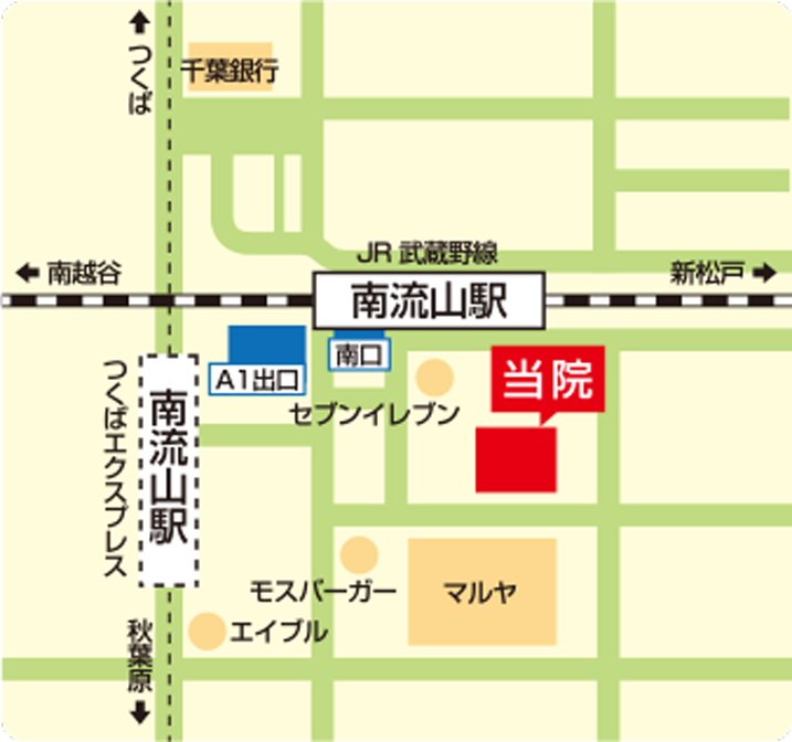 | つくばエクスプレスをご利用の方は、A1出口より地上へ上がり直進してください。 | JR武蔵野線をご利用の方は、南口を出て左手にお進みください。 |