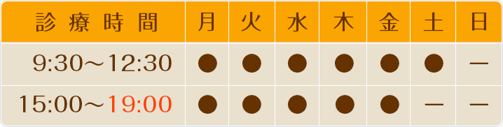 土曜 9:30 - 12:30 休診日 土曜午後、日曜、祝日