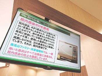 待ち時間を有意義にお過ごし頂けるよう、待合室など院内の各所に設置したモニターで、設備のご紹介や耳鼻咽喉科領域の病気に関する説明を行っております。