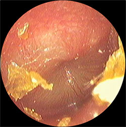 ・左図の処置後から1週間後、鼓膜内側には液体は溜まっておらず、正常の鼓膜の色である