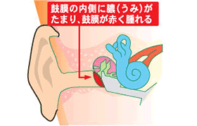 鼓膜の内側の中耳と呼ばれる部分にバイ菌(細菌やウイルス)が侵入し、炎症が起きている状態です。