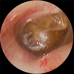 ・鼓膜の内側に褐色の液体の貯留を認める